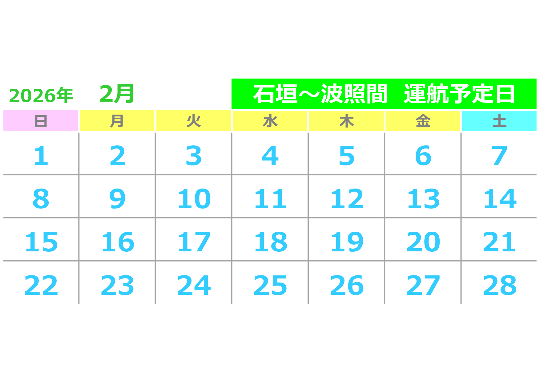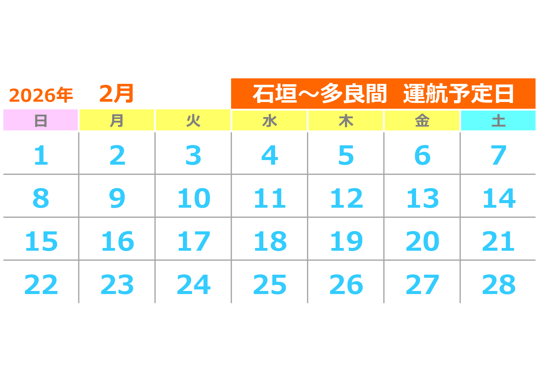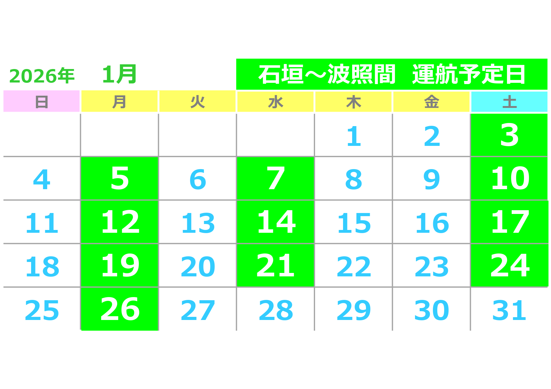 - 石垣~波照間便運航日:月・水・土曜日 石垣~多良間便運航日:月・土曜日 追加便・運休予定等、運航カレンダーはこちら